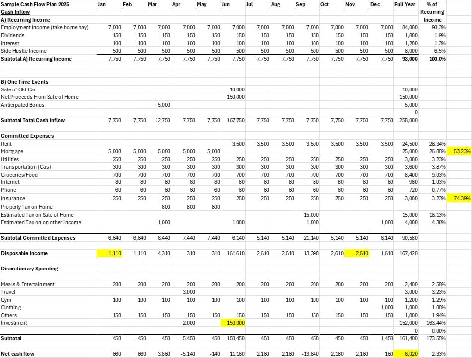 This fictional person who is eerily similar to me had a home that he was planning to sell. This person also planned to downsize to one car instead of two so he expects extra cash inflow in the same month. Since this is a PLAN, you don’t know the actual proceeds from the sale. But as usual, I recommend you put in a conservative figure. Do some market research. You also don’t know the TIMING of the sale but let’s just say the closing of the home will be in June. Also to note on the sale of the house, this person has a mortgage. From the sales price, typically you should subtract: a) remaining mortgage balance b) commission c) estimated legal fees d) any land transfer taxes (usually borne by the buyer in Canada). In North America, typically you’d work with a lawyer and the lawyer will ensure each party gets their share. Note that you would not pay the capital gains tax until later so it’s important to account for that. In this example, let’s say the capital gains tax on the property is $15k and payable a few months later.